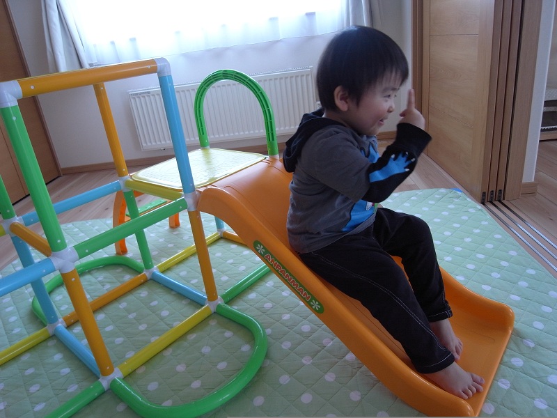 R君がもらったクリスマスプレゼントで遊ぶ我が子。