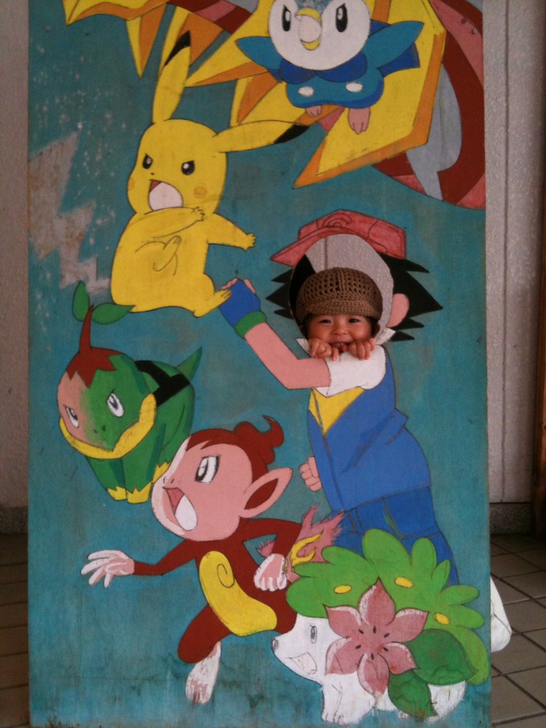 ホテル前の顔出しパネルにて。