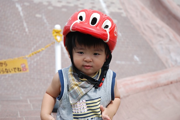 ヘルメットをかぶる我が子。