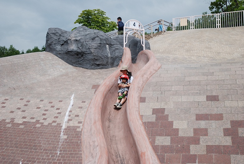 こんな急なすべり台が何個もあり、子供はヘルメット着用必須なんです。