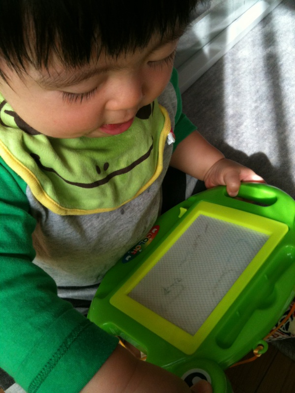 さっきこの磁石のおえかきボード(カエル型)のえんぴつを書くような仕草で動かしてたので、こうやって書くんだよって見せたら書いた!!