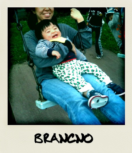 この写真の笑顔はブランコで楽しいっていう笑顔なのか小学生を見ての笑顔なのか…どっちかな~。