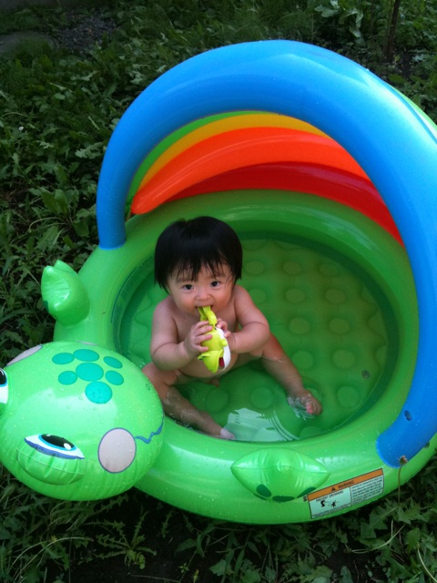 1人以上でプール遊び初めての体験。でも2人で遊んだらあのカエルプールだと狭かったな~。でも楽しそうだった。