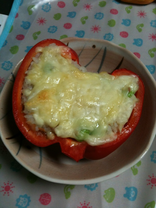 炊き上がったご飯にシーチキンと枝豆をあえてパプリカにつめてチーズをのせてトースターで焼くだけ。