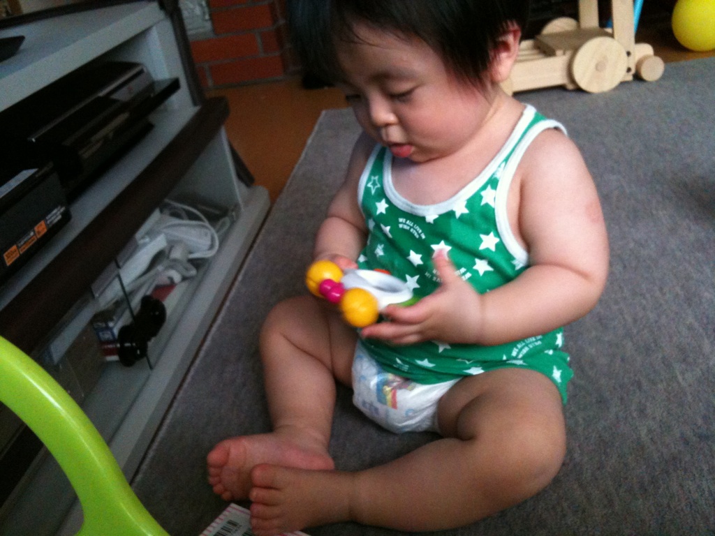 最近どこにもつかまらないで何秒か立つようになった。でも進まずしりもちをつく。3日早く産まれた友達の子はもう歩き始めたらしい!その子は成長が早くて感心しちゃいます。来週会う予定なので楽しみだなぁ。