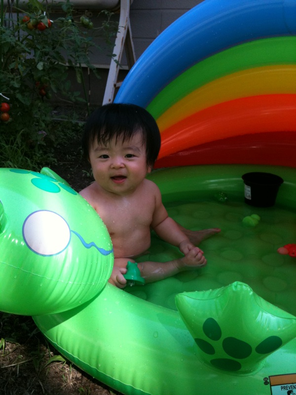 いつものプールの場所が日陰になってたんで。日なただと見てるのが辛いんでやってないんですが今日もさすがに暑いのでプール開きしました。