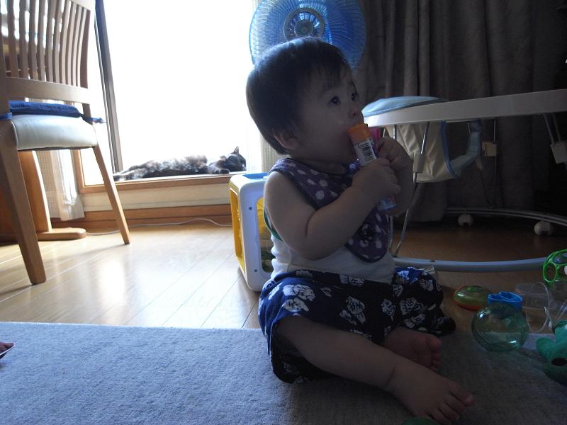 暑いかなーと思って甚平着せました。でもズボンのみですが…。