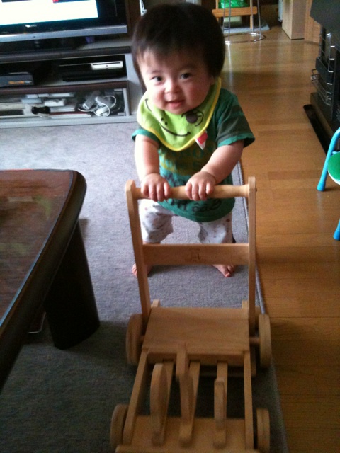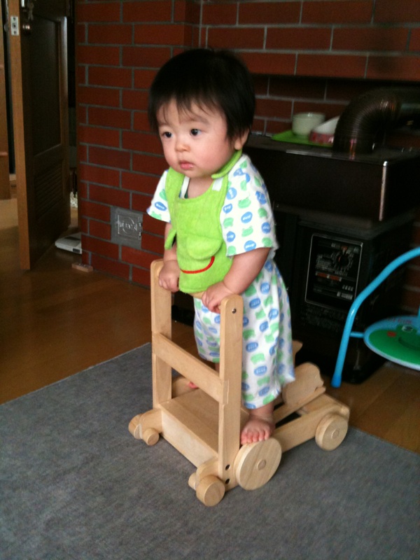 今朝、急に手押し車に立った我が子。