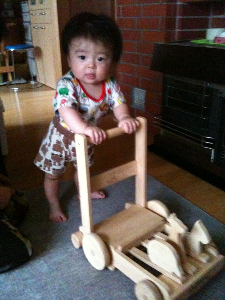 母が心配して仕事休みの日に来てくれて手押し車買ってくれました。新品じゃないんですけどリサイクルなんですけどね。でもリサイクルにしては良品だったし安かったです。(値段はあんまり言うとアレなんで控えますけど3ケタです 笑)さっそく我が子に押してもらいました。
