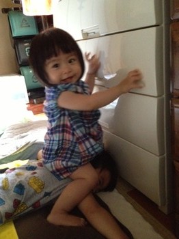 きーちゃんがつかまり立ちしてたら股の間に入り込んだゆう、そのゆうに乗っかるきーちゃん…。