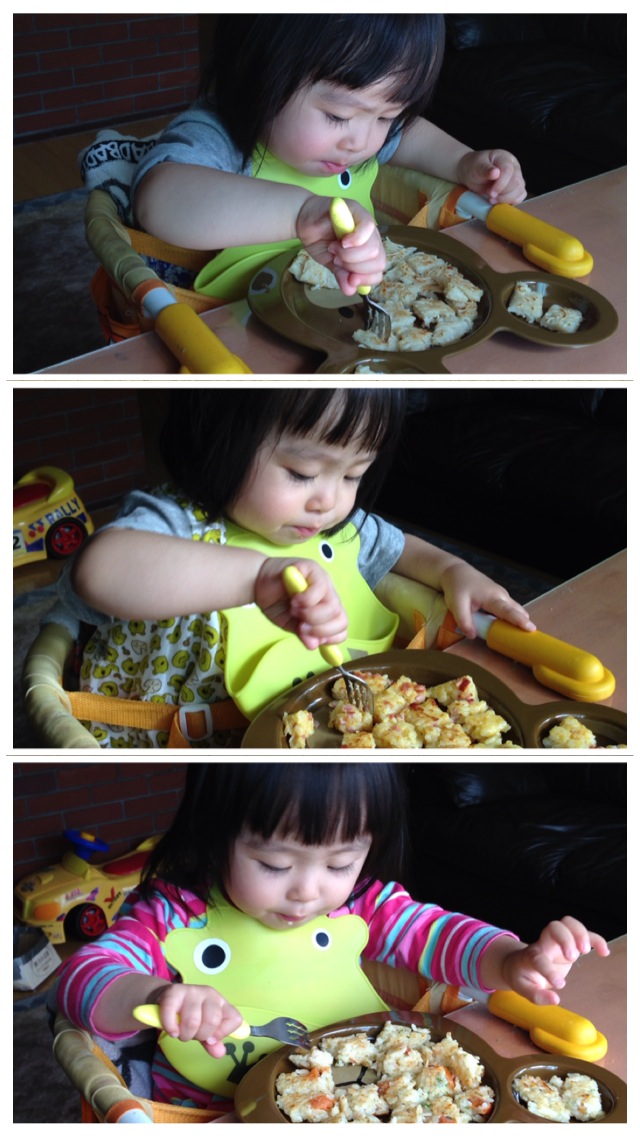 白飯(ふりかけ)、ケチャップライス、海苔巻き、カレー、ホットケーキ、ピザ、パン類、ラーメン、果物、とうもろこし、フライドポテト、粉拭き芋、ハンバーグ、味噌汁、うなぎ、焼き魚全般、ウィンナー、玉子焼き、パスタ、揚げ物 が好き。